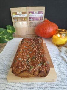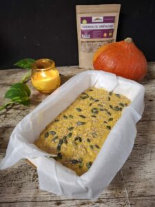 Na liquidificadora, triture a abóbora cozida com os ovos, o iogurte, a curcuma, a água, 150g tâmaras em pó e junta canela do Ceilão Outros Montes a gosto.