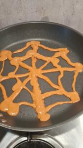 Tritura tudo e verte num doseador de boca fina para ser mais fácil desenhar a teia de aranha.
