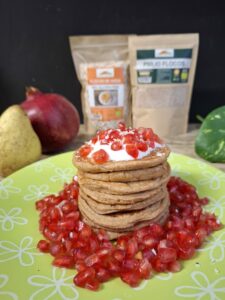Monta as tuas panquecas e serve. Eu coloquei um pouco de iogurte no topo, romã e coco ralado Outros Montes como topping.